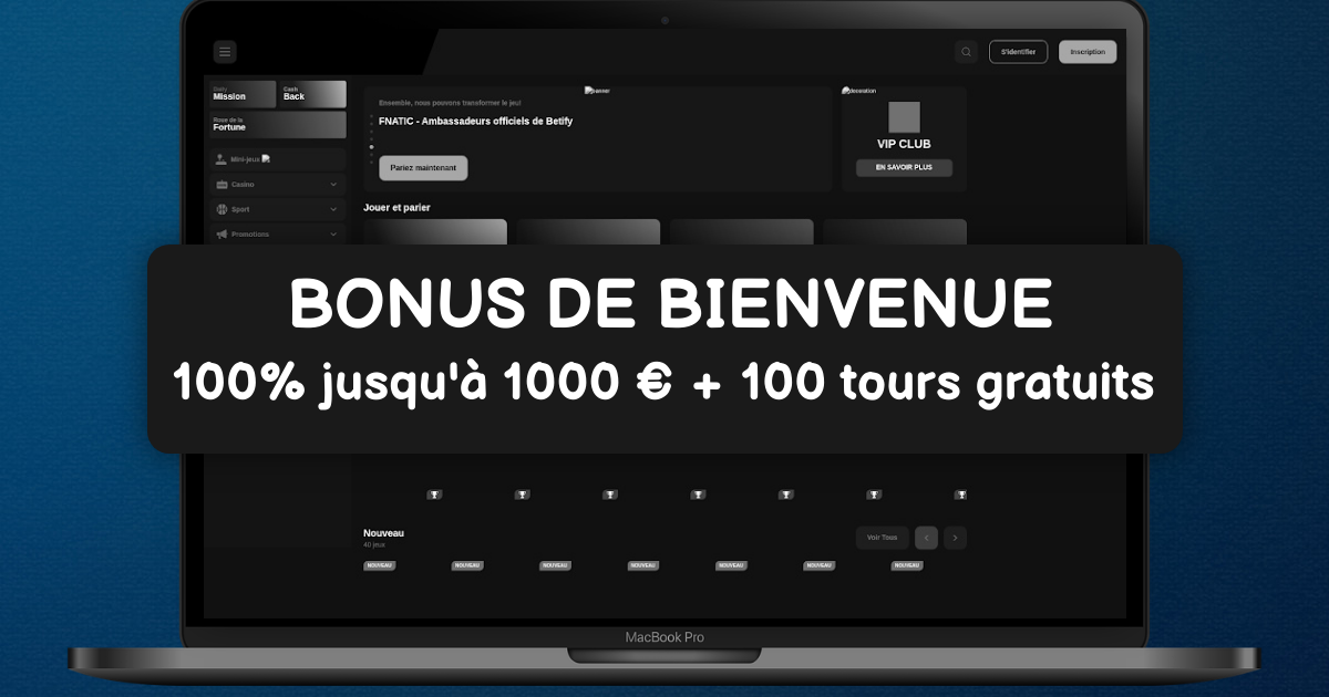 Betify Casino propose un bonus de bienvenue jusqu'à 1 000 € + 30 Free Spins pour le casino, ou 100 % jusqu'à 100 € en Freebet pour les paris sportifs. Il y a aussi du cashback jusqu'à 20 %, des missions quotidiennes et un programme VIP sur 18 niveaux avec des récompenses exclusives, sans wager pour certains.